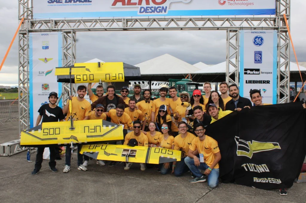 Na universidade, participei da equipe Tucano Aerodesign na parte de estabilidade e controle, área que envolve mecânica de voo e engloba todas as partes de um projeto de aeronave. Levei uma proposta de modelar a aeronave do ano de 2022 no simulador de voo X-Plane. Participei da competição daquele ano como trainee. Foi bom estar em São José dos Campos.