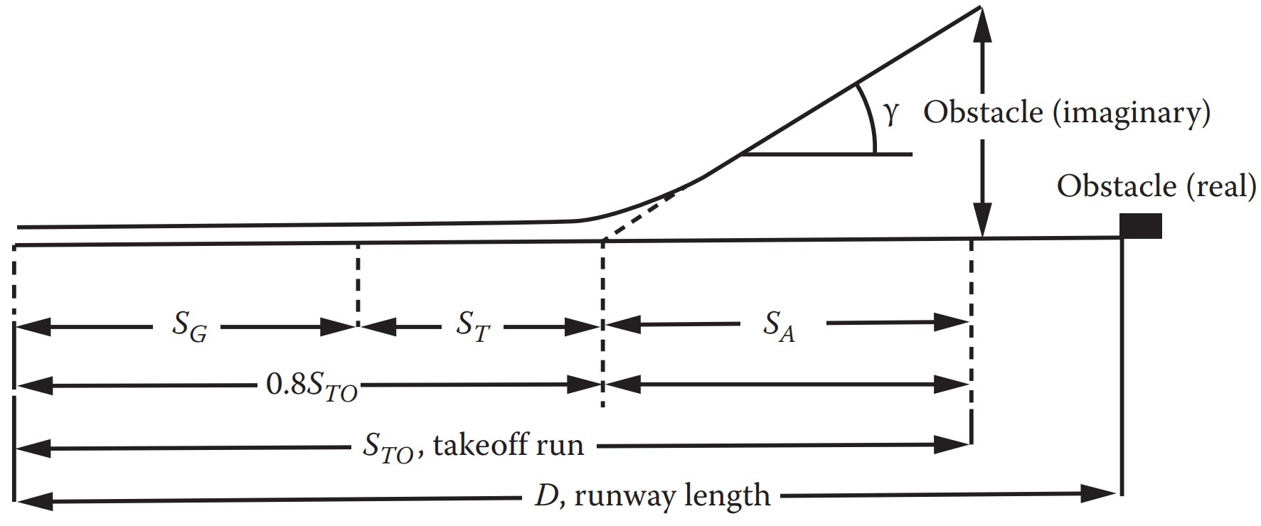 \[\begin{aligned} S_G &= \frac{22000}{1,225 \cdot 51,18 \cdot 0,1215} \ln \left[ \frac{0,3122 - 0,030}{(0,3122 - 0,030) - \frac{1,1^2 \cdot 0,1245}{2,2}} \right] \\ S_G &= 835 \text{ m} \end{aligned}\]14.4 Comprimento de Pista na Fase Aérea ($S_A$)