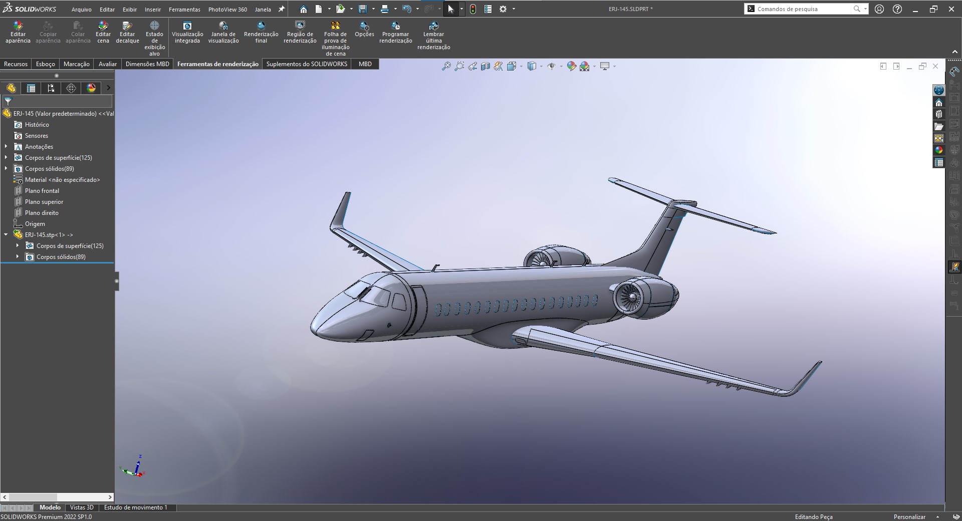 A área molhada, é a área que é exposta ao escoamento de ar duarante o voo. Para determiná-lo pode-ser usar relações empíricas de aeronaves já produzidas através de tabelas ou pode-se usar softwares CAD para estimar com mais precisão a área molhada de cada componente da aeronave. Para nosso trabalho usamos um modelo CAD do embraer 145 disponível para download, conforme imagem e tabela abaixo: