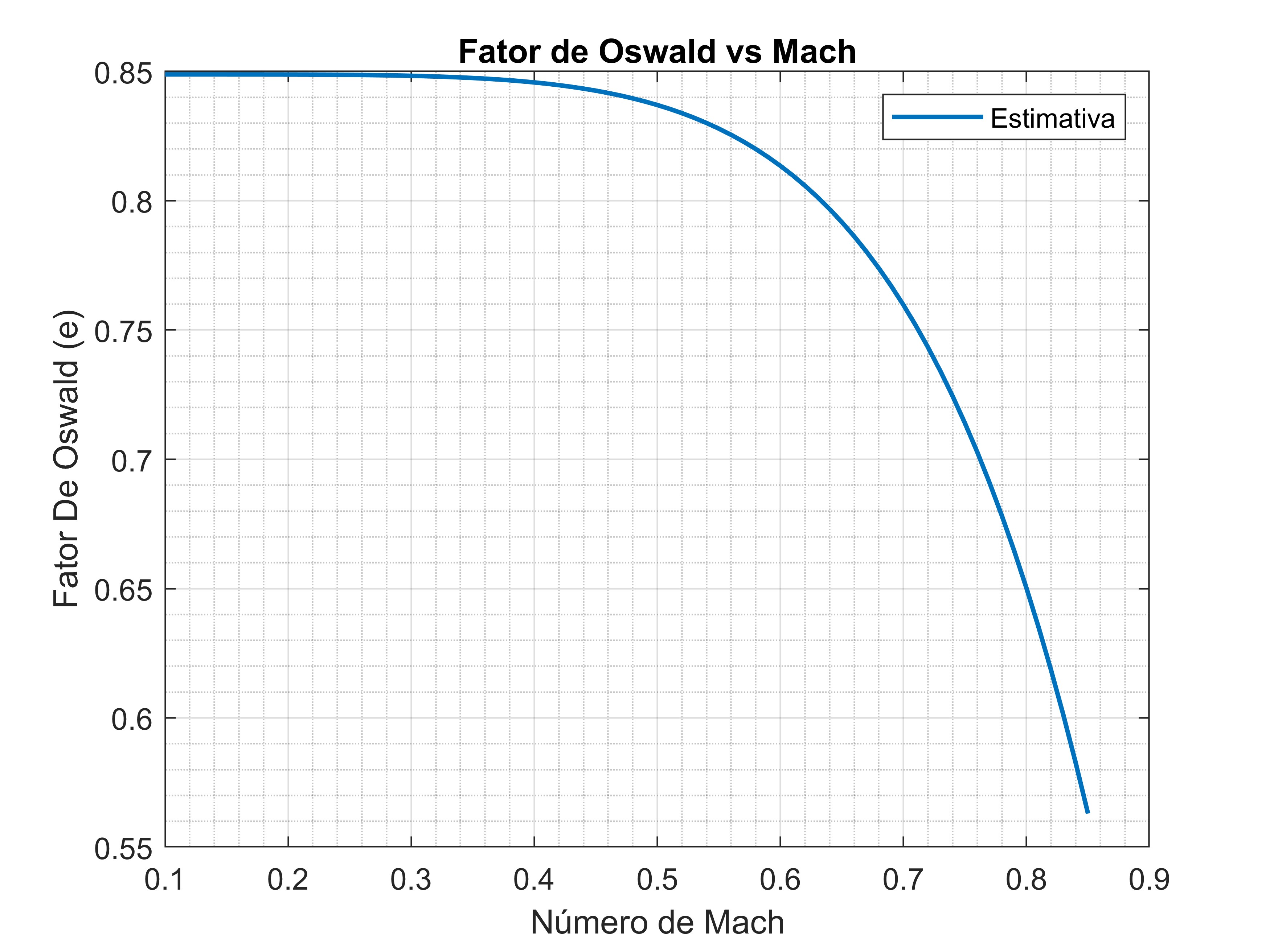 Destacamos que apesar da aeronave voar em M 0,78 usamos um M 0,60 pois a inflûencia do número de Mach no fator de Oswald aumenta bastante após M 0,6, e isso traria imprecisão no cálculo estimado do fator de Oswald, a seguir mostramos como a inflûencia do número de Mach impacta sobre o fator de Oswald para o EMB-145LR, a figura abaixo indica a região onde o fator não varia com Mach, porém no regime transônico ocorre signifcativa alteração.