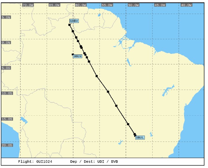 Rota proposta entre Uberlândia-MG e Boa Vista-RR