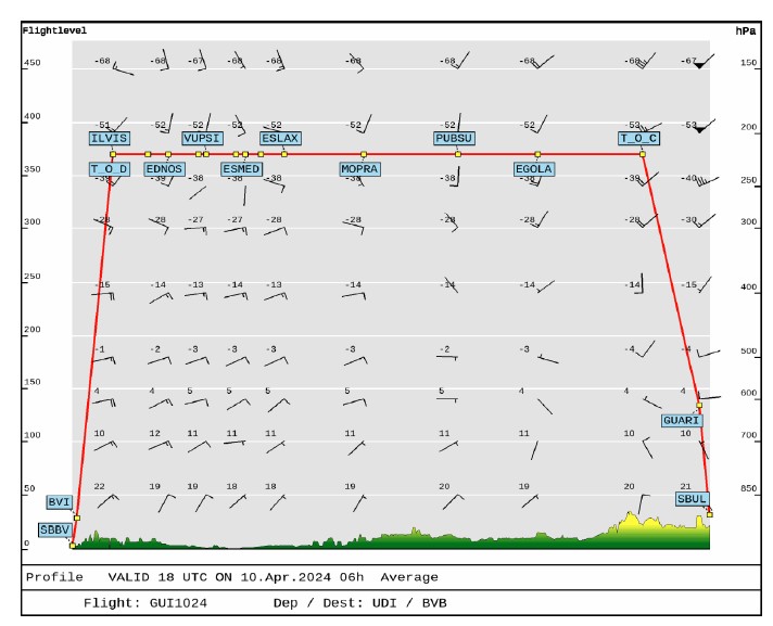 Missão completa para o voo proposto, e os perfis de vento em diferentes altitudes