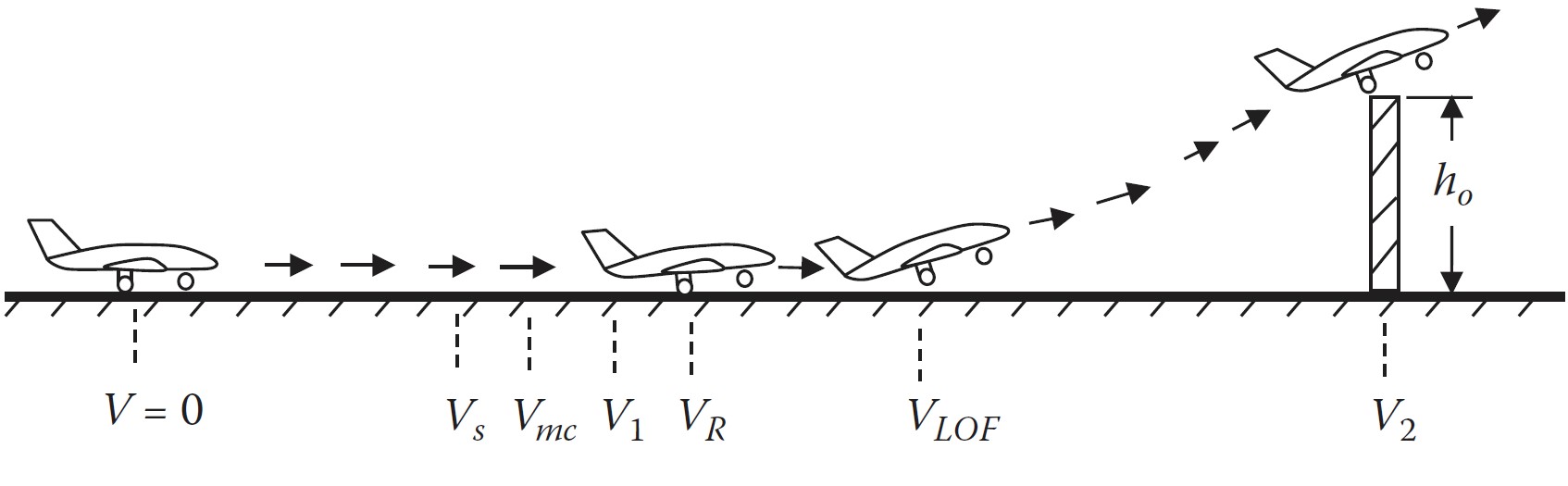 \[\begin{aligned} V_{mc} &= \sqrt{ \frac{2 \cdot 5590}{1,225 \cdot 14,23 \cdot 0,9} } \\ V_{mc} &= 26,70 \text{ m/s} \end{aligned}\]14.2 Comprimento de Pista na Fase de Rotação ($S_R$)